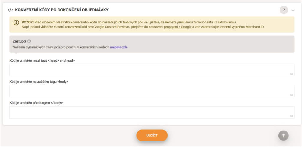 Pokud máte uložený widget děkovačky přímo v sekci Vlastní konverzní kódy, nejprve ho odstraňte a změnu uložte. Je důležité, aby zde nebyl uložen žádný widget děkovačky – ani český, ani slovenský.