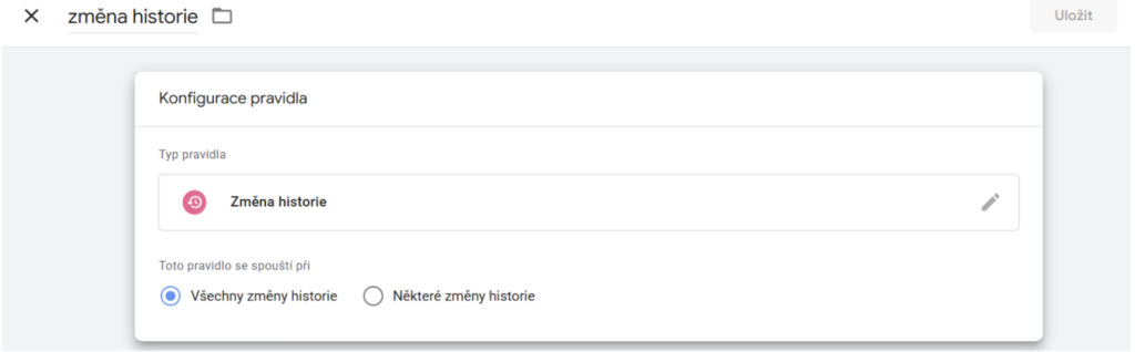 Dalším pravidlem je změna historie. Opět vytvoříme nové pravidlo, které si pojmenujeme jako změna historie, jako typ pravidla vybereme změna historie a všechny změny historie. Následně uložíme.
