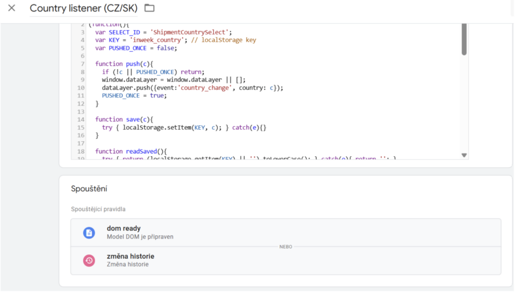 Přecházíme na záložku štítky, kde budeme vytvářet jednotlivé tagy. První si vytvoříme Country listener (CZ/SK). Jako značku zvolíme vlastní HTML a vložíme skript, který naleznete v odkazu: https://gist.github.com/Linkyc89/015496b469883500c889fb7fbcfa3e6b. Jako spouštěče zvolíme DOM ready a změna historie, které už máme vytvořené.