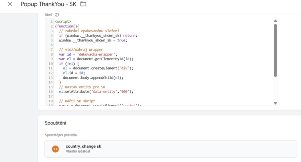 Stejný postup opakujeme i pro SK pop up, viz obrázek níže, vložíme SK skript https://gist.github.com/Linkyc89/cce75c13a30561de9f68cb331103e36e a upravíme opět číselný identifikátor z pluginu pro SK, viz popis výše, a změníme spouštěč na country_change sk