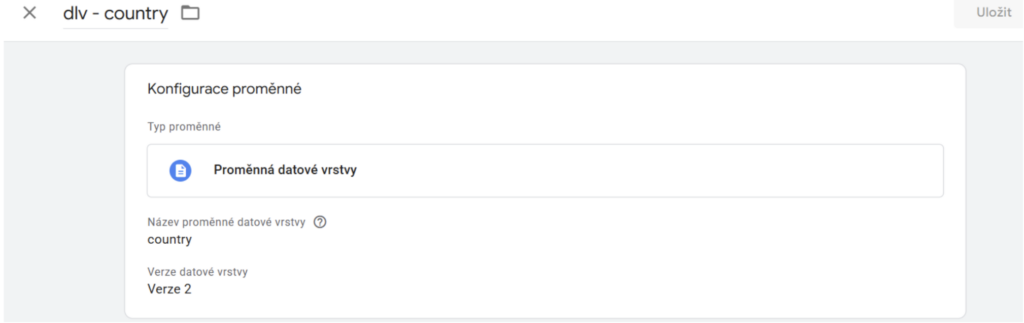 Z hlavního přehledového okna GTM je proklikneme do proměnných a vytvoříme novou proměnou, kterou přejmenujeme např. na dlv – country, zvolíme jako typ Proměnnou datové vrstvy a nazveme ji přesně country a uložíme.