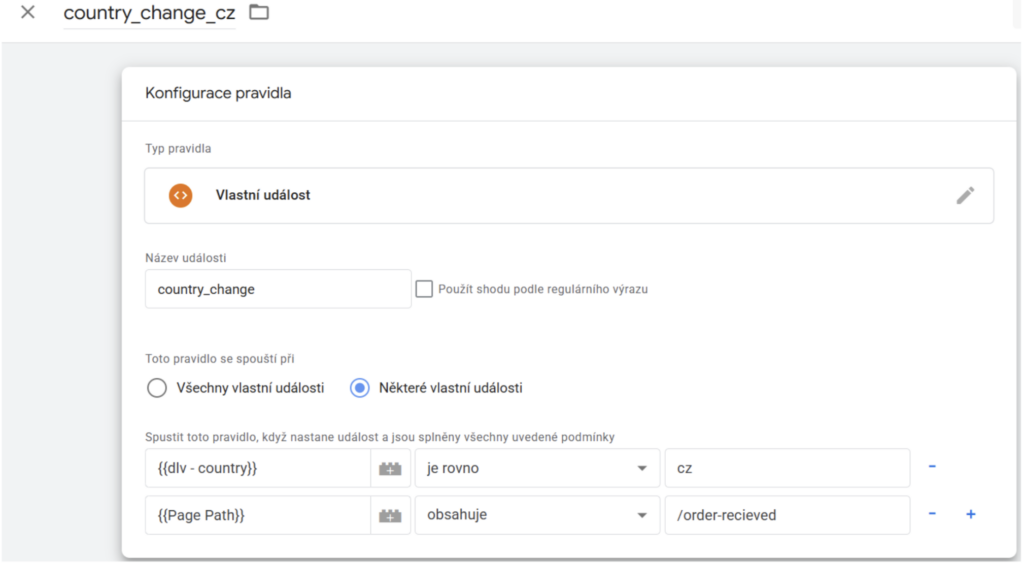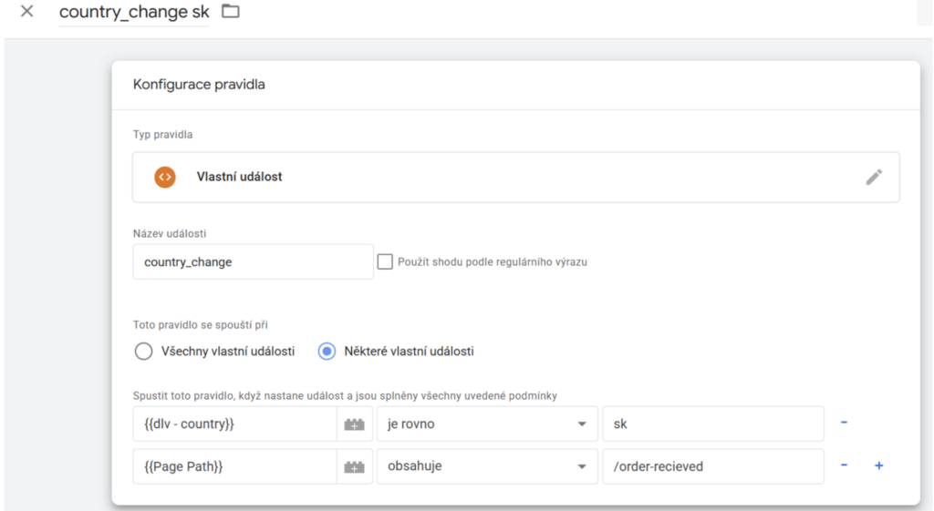 Půjdeme na tvorbu pravidel. Přejdeme tedy na záložku pravidla a vytvoříme si nové pravidlo, které nazveme country_change_sk, jako typ zvolíme vlastní událost a jako název uvedeme country_change. Nastavení spouště zvolíme některé vlastní události, vybereme proměnou {{dlv – country}} je rovno cz. Jako druhou podmínku zvolíme Page Path obsahuje /order-recieved
