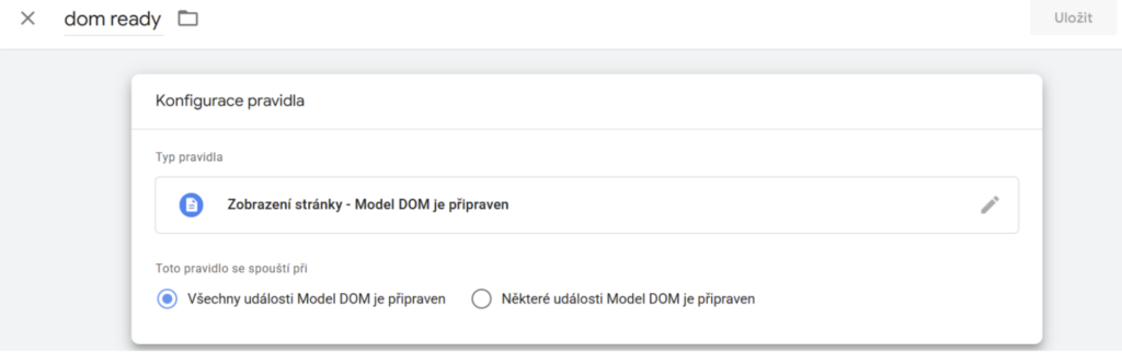 a přejmenujeme na dom ready. V konfiguraci pravidla vybereme Model DOM je připraven