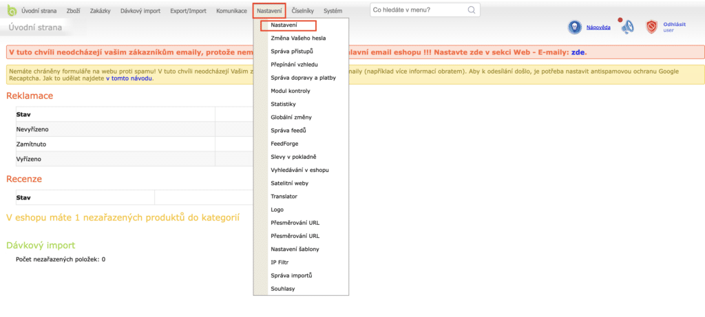 Ve vašem e-shopu přejděte do horního menu Nastavení a následně znovu klikněte na Nastavení.