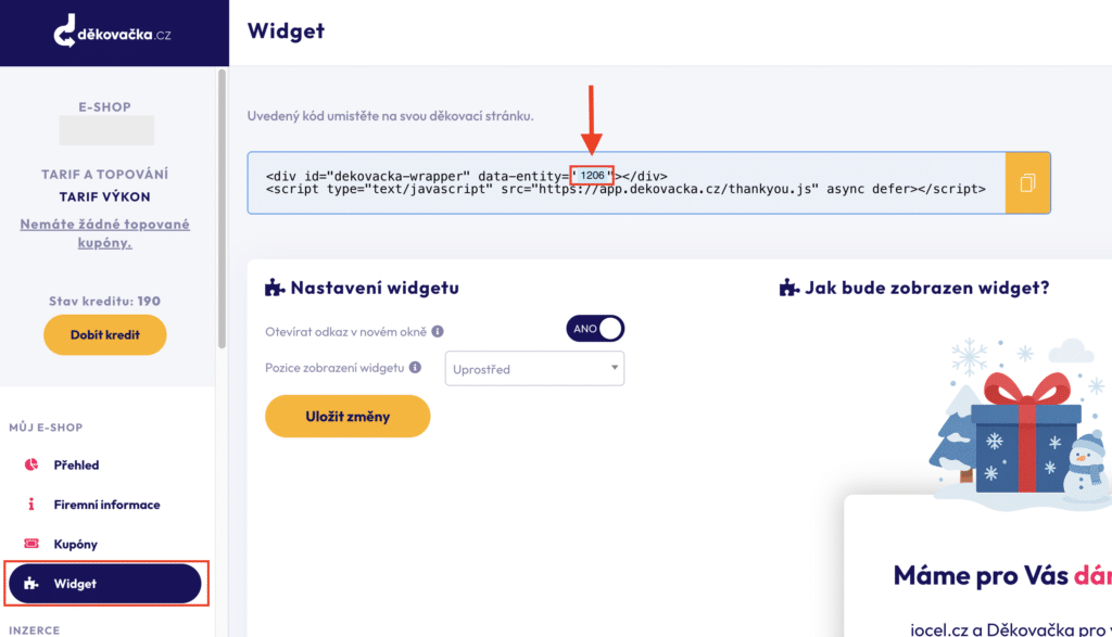 1.) Přihlaste se do administrace Děkovačky a otevřete si sekci “Widget”, kde z uvedeného kódu zkopírujte data-entity.