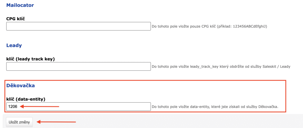 4.) Sjeďte na konec stránky k oddílu Děkovačka a do pole klíč (data-entity) vložte zkopírované data-entity z Děkovačky.