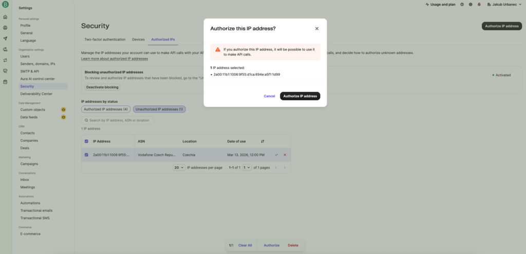 - V Brevo přejděte do Settings → Security → Authorized IPs.
