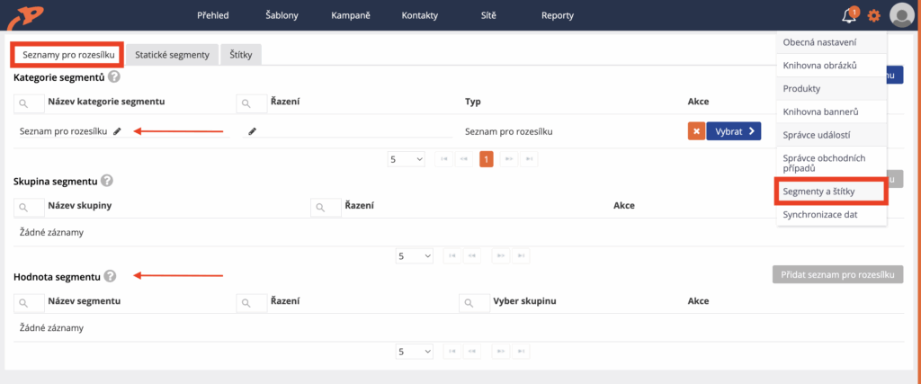 - Název Seznamu – Pro vytvoření nového seznamu, zvolte ozubené kolečko v pravém horním rohu rozhraní Incomakeru a poté segmenty a štítky. Poté v záložce “Seznamy pro rozesílku” zvolte v kategorii segmentu název dané kategorie, kam chcete vytvořit nový seznam a zvolte vybrat. Dále v “Hodnota segmentu” budete moci vytvořit nový seznam.