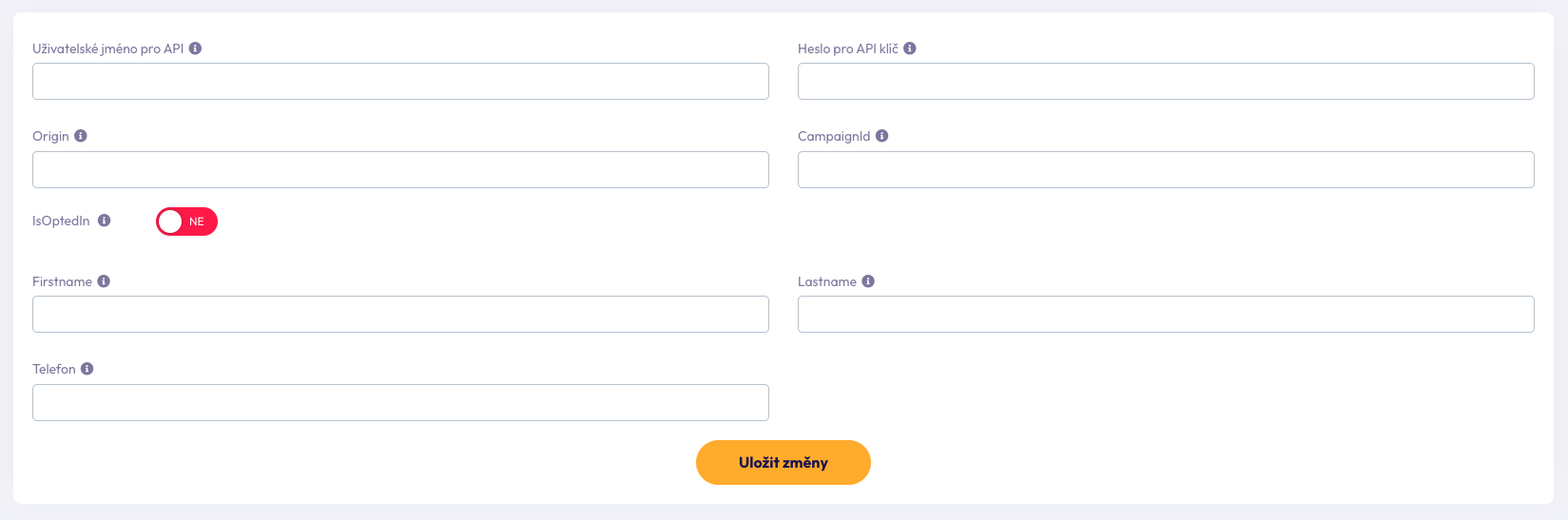- Uživatelské jméno pro API – Zde vložte uživatelské jméno, které získáte ve svém účtu sekci Nastavení -> API.